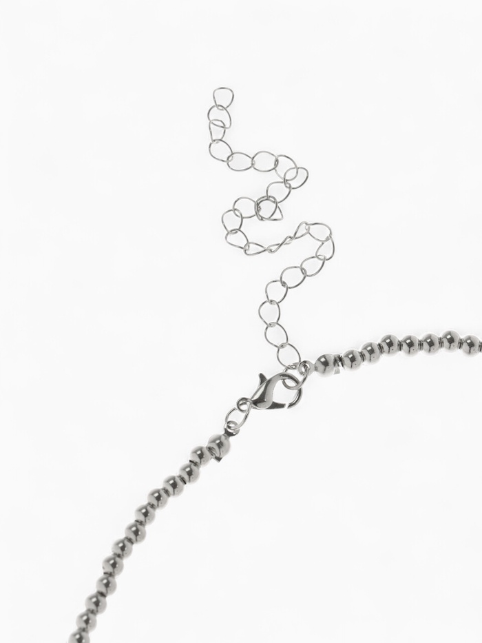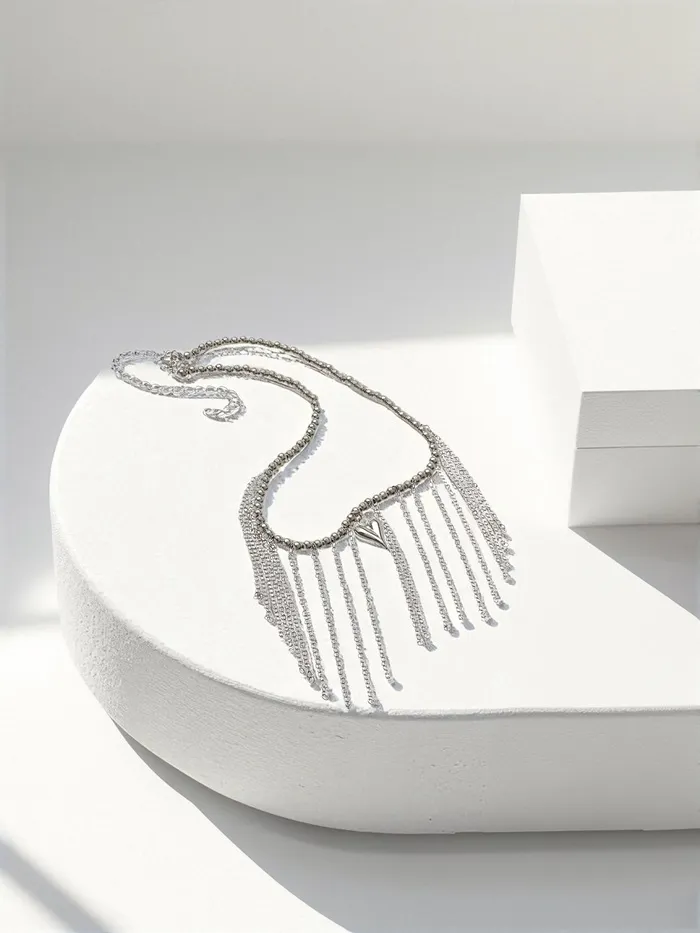 Серебристое колье с эффектом водопада из бусин создаёт изящную игру света и объёма, подчёркивая женственность и утончённость образа. Длина 32 см делает украшение заметным, но при этом лёгким и комфортным для ежедневного ношения.