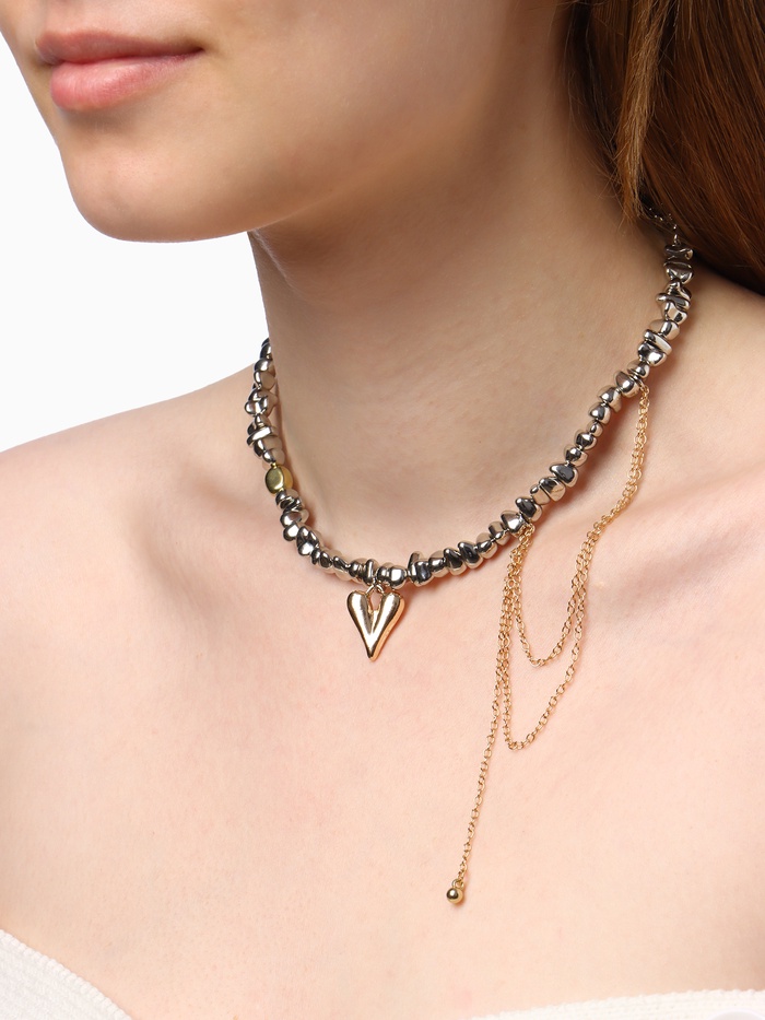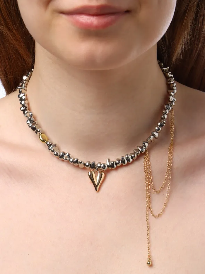 Изысканное украшение длиной 30 см сочетает в себе лёгкость и выразительность благодаря золотому и серебристому оттенку и ярким цветным вставкам из пластика и металла. Эффект «водопада» подчёркивает плавность линий и динамичность дизайна, а подвеска в форме сердца добавляет эмоциональную глубину и символизм.