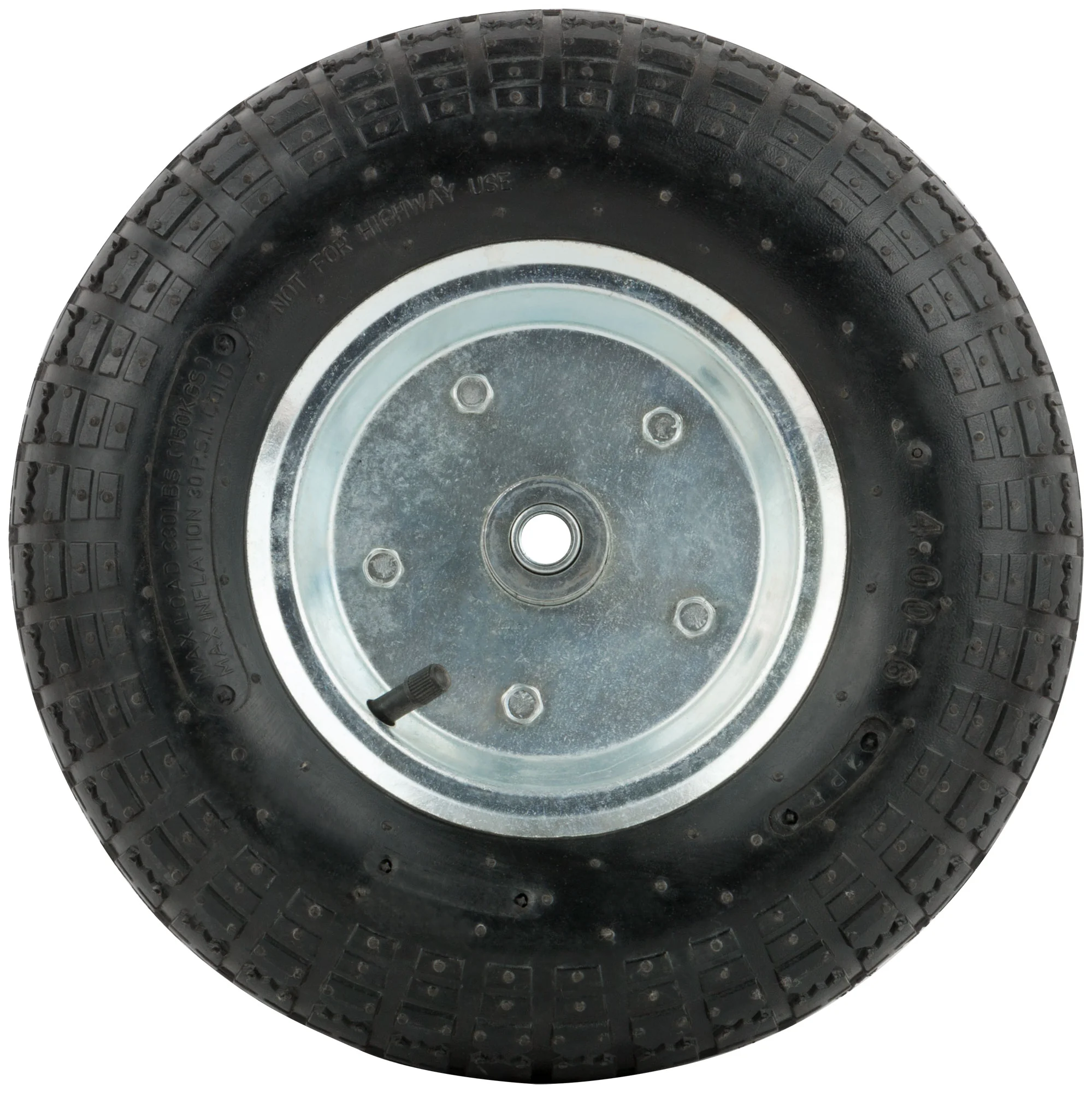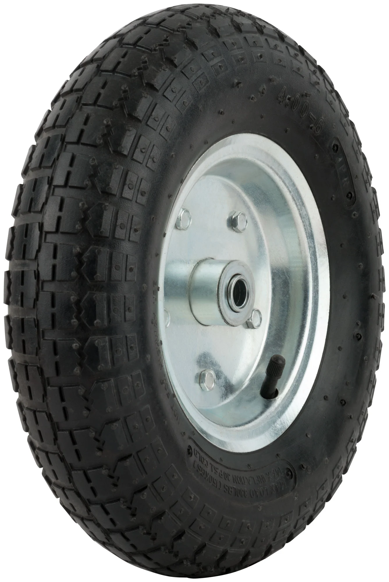 Колесо оснащено резиновой шиной и камерой, что гарантирует отличное сцепление и длительный срок службы. Шариковый подшипник из высокоуглеродистой стали обеспечивает легкость вращения, а оцинкованный диск предотвращает коррозию и увеличивает долговечность колеса.