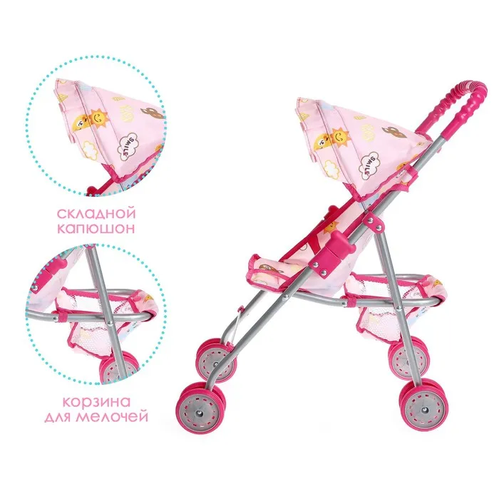 Каркас коляски выполнен из металла, колёса — из пластика. Пупс принимает в ней сидячее положение. Ручка не регулируется, не перекидная. Тканевая основа отстёгивается, что позволяет в любой момент её почистить. Расстояние от пола до ручки — 52 см. Функции качания нет.