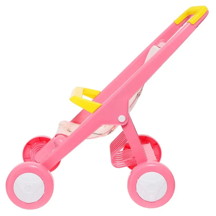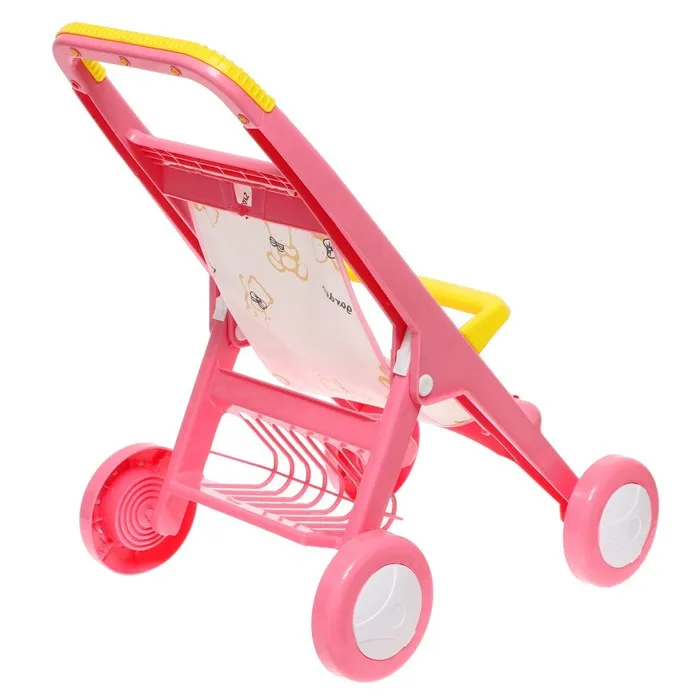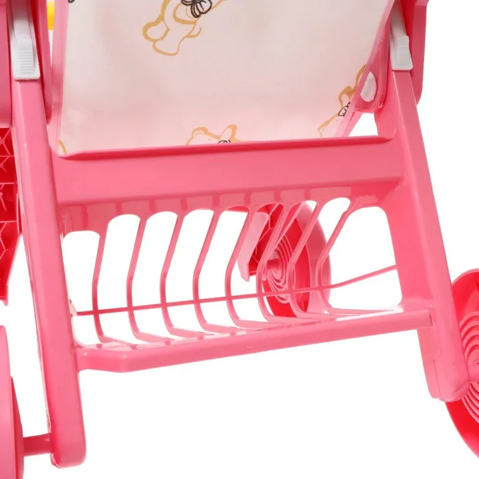 - Коляска имеет высоту 58 см, что делает игру комфортной даже для маленьких девочек. Устойчивость обеспечена четырьмя колёсами, которые свободно вращаются без лишнего усилия.