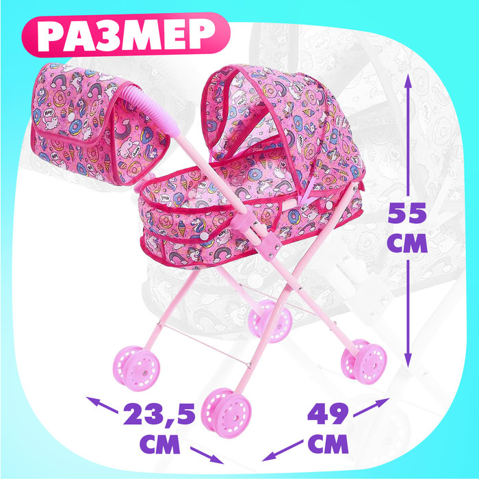 Высота от пола до ручки (не регулируется) — 55 см; размер люльки — 33 × 17 × 8 см; размер коляски — 49 × 23,5 × 55 см. В комплекте представлена сумка для хранения нужных вещей, её размер: 18 × 9 × 14 см.