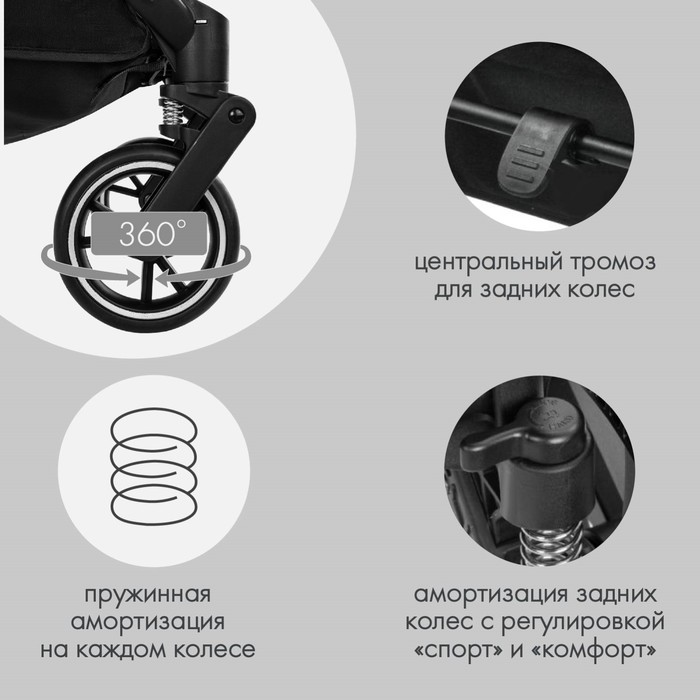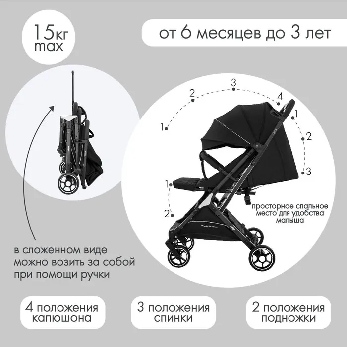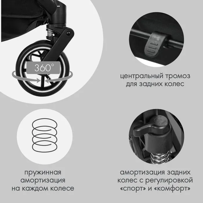 · Свободная регулировка спинки, включая горизонтальное положение, для удобства во время длительных прогулок;