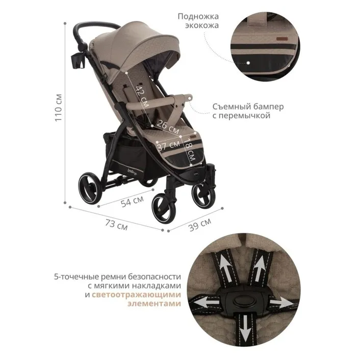 Подножка из экокожи практична в уходе, достаточно протереть влажной губкой. Коляска для осени, для весны, для зимы оснащена 5-точечными ремнями безопасности с мягкими накладками.