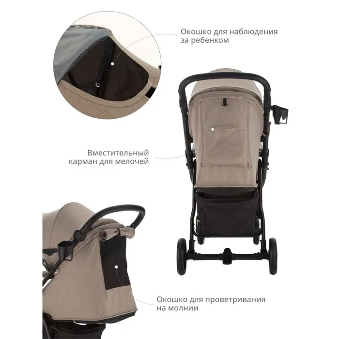 Коляска оснащена удобным окошком для наблюдения за ребенком. Имеется также окошко на молнии для проветривания в теплое время года и вместительный карман для мелочей.