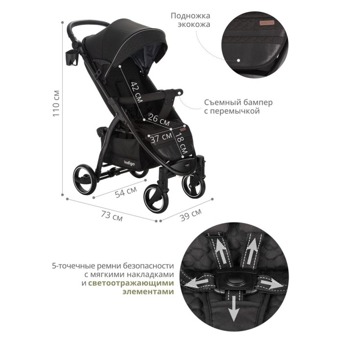 Подножка из экокожи практична в уходе, достаточно протереть влажной губкой. Коляска для осени, для весны, для зимы оснащена 5-точечными ремнями безопасности с мягкими накладками.