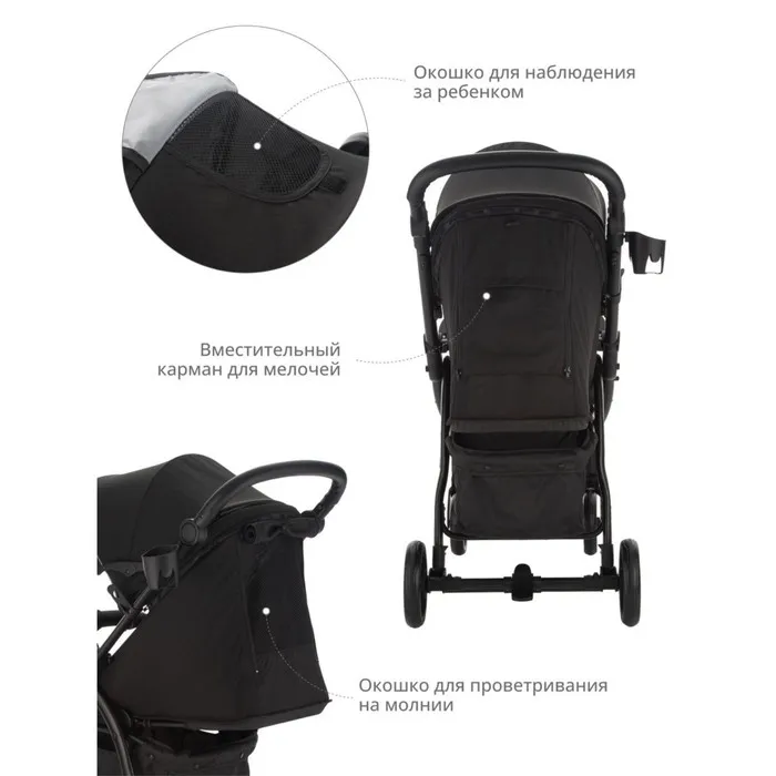 Коляска оснащена удобным окошком для наблюдения за ребенком. Имеется также окошко на молнии для проветривания в теплое время года и вместительный карман для мелочей.