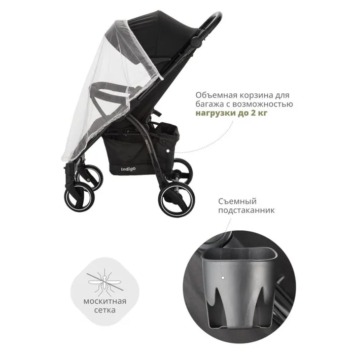 В комплекте аксессуары для коляски: москитная сетка для защиты от насекомых, подстаканник, съемная вместительная открытая корзина для багажа и покупок. Корзина выдерживает нагрузку до 2 кг.