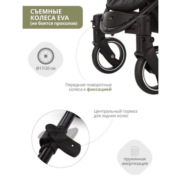 Коляска прогулка легкая и маневренная. Колеса EVA из современного мягкого эко материала, по свойствам схожи с резиной, но более легкие и не боятся проколов. Пружинная амортизация на передних и задних колесах обеспечивает мягкость хода по неровностям. Передние колеса поворотные с фиксацией. Тормоз центральный.