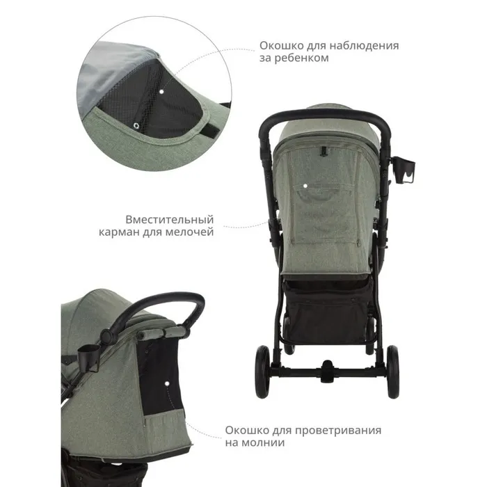Коляска оснащена удобным окошком для наблюдения за ребенком. Имеется также окошко на молнии для проветривания в теплое время года и вместительный карман для мелочей.