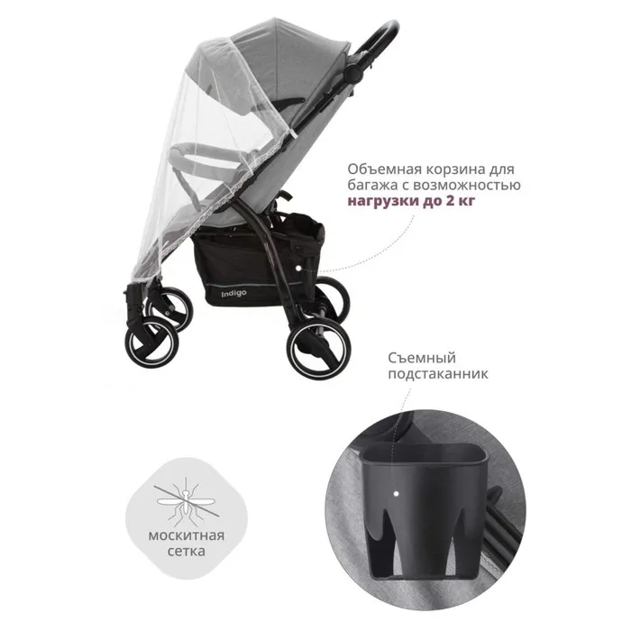 В комплекте аксессуары для коляски: москитная сетка для защиты от насекомых, подстаканник, съемная вместительная открытая корзина для багажа и покупок. Корзина выдерживает нагрузку до 2 кг.