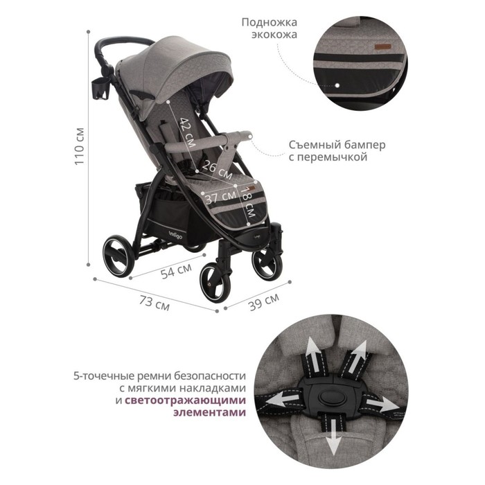 Подножка из экокожи практична в уходе, достаточно протереть влажной губкой. Коляска для осени, для весны, для зимы оснащена 5-точечными ремнями безопасности с мягкими накладками.