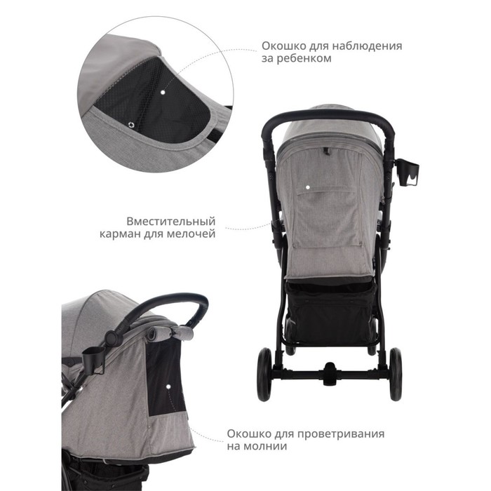 Коляска оснащена удобным окошком для наблюдения за ребенком. Имеется также окошко на молнии для проветривания в теплое время года и вместительный карман для мелочей.
