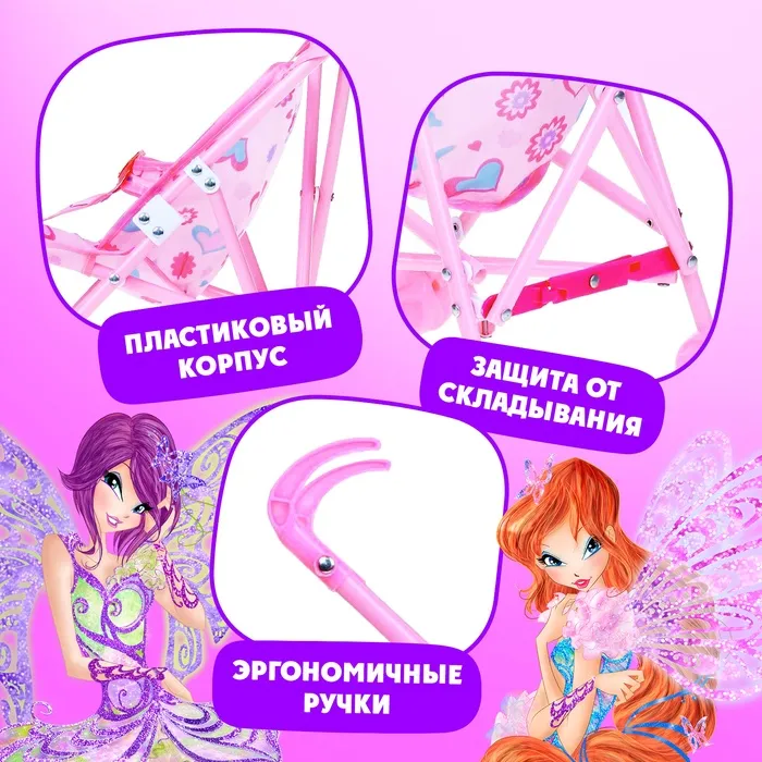 Малышка с радостью присоединится к героиням любимого мультфильма, будет заботиться о своём пупсе и катать его в яркой и удобной коляске с логотипом Winx.