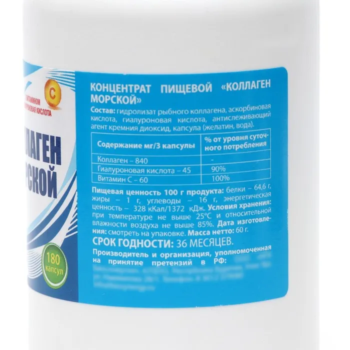 Гидролизат рыбного коллагена, аскорбиновая кислота, гиалуроновая кислота, антислеживающий агент кремния диоксид, капсула (желатин, вода).