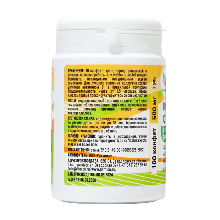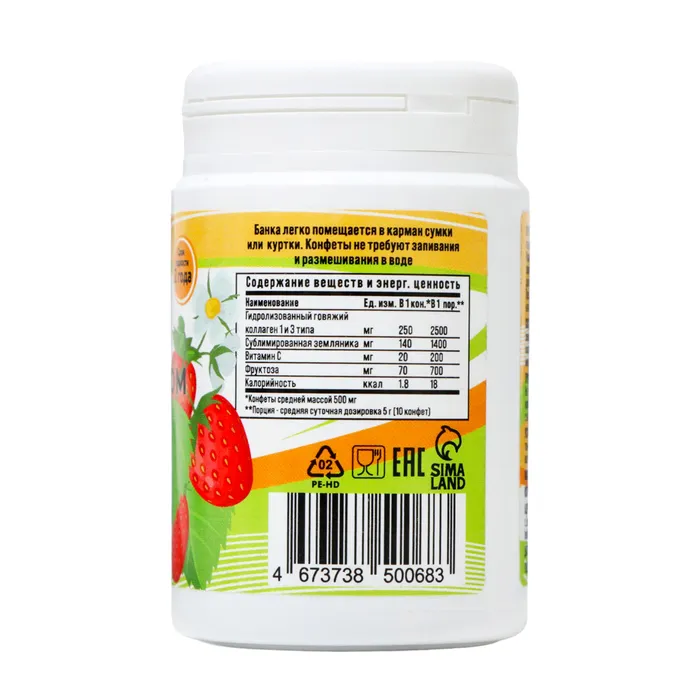 Коллаген жевательный с натуральной земляникой Vitamuno — это пищевая добавка, содержащая гидролизованный говяжий коллаген I и III типа, гиалуроновую кислоту и витамин C. Этот комплекс предназначен для поддержания здоровья кожи, волос, ногтей, суставов и связок.