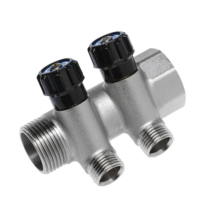 Коллектор 1" на 2 выхода диаметром 1/2" с вентилями применяется в трубопроводах систем горячего и холодного водоснабжения, многоконтурных установках водяного отопления (напольного, радиаторного с лучевой разводкой). В системах водоснабжения распределительный коллектор снижает взаимное влияние потребителей, обеспечивает равное входное давление.
