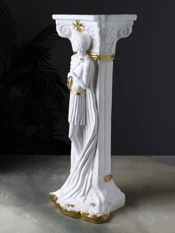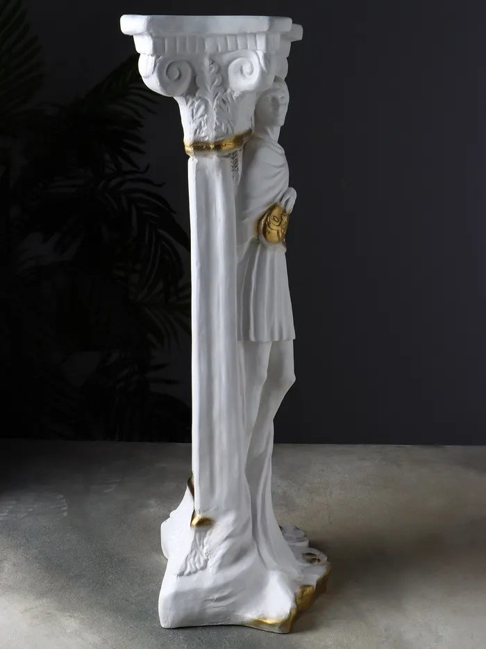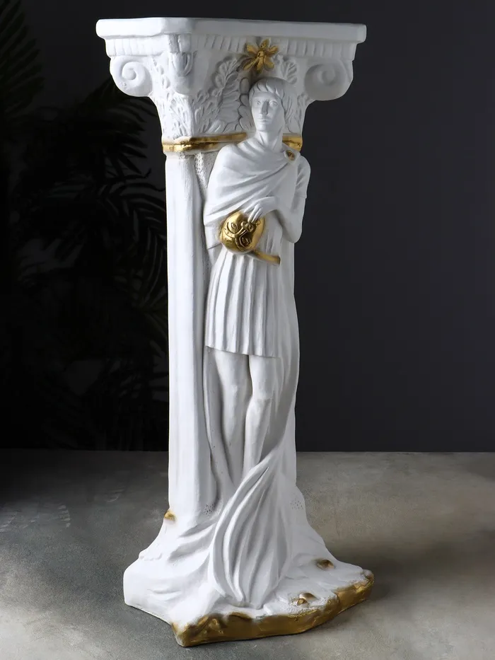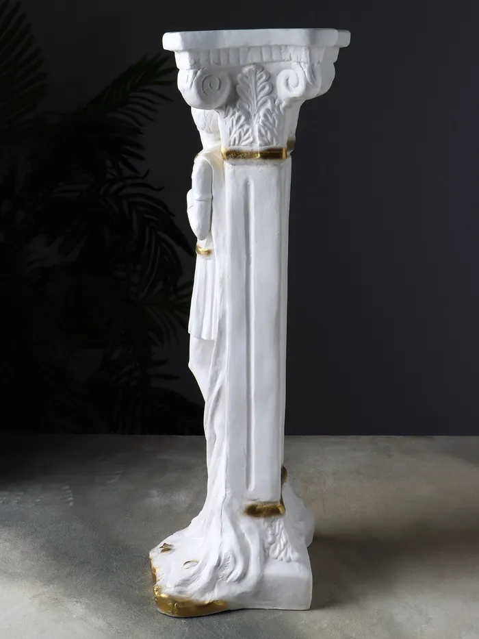Поверхность изделия выполнена в контрастной цветовой палитре: золотистые переливы мягко переходят в белоснежные участки, создавая эффект росписи или частичного окисления металла. Такое оформление подчеркивает детализацию мимики, складок одежды и рельефности формы. Габариты (25×20×65 см) позволяют разместить колонну как в просторном холле, так и на фоне минималистичного интерьера, не перегружая пространство.