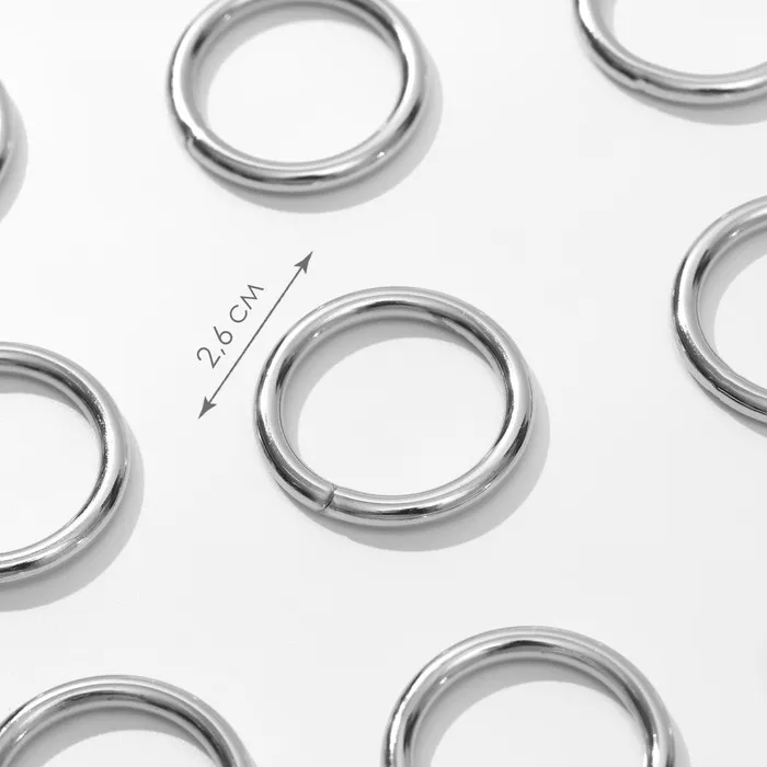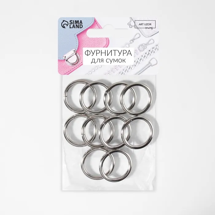 Металлические кольца для сумок от «Арт Узор» — прочная фурнитура для ремонта аксессуаров, рукоделия и организации пространства. Набор из 10 серебристых колец внутренним диаметром 20 мм подходит для работы с плотными тканями, кожей и декоративными элементами. Универсальный размер делает их удобными для повседневного использования.
