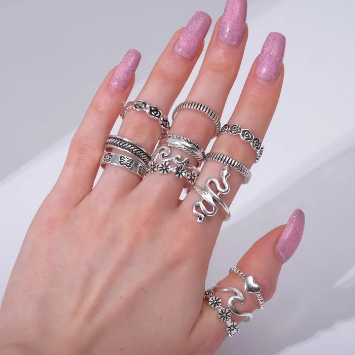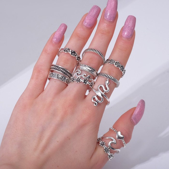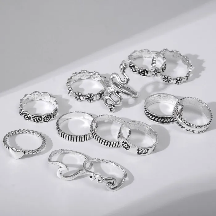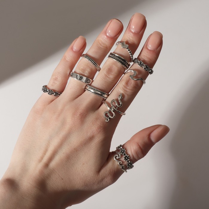Кольца набор 13 штук «Ассорти» цветы, змея, размер МИКС, цвет чернёное серебро — Характеристики