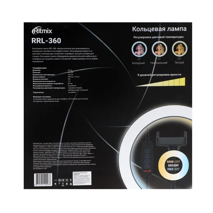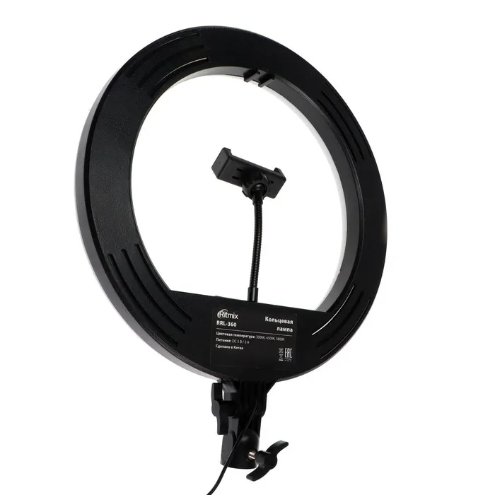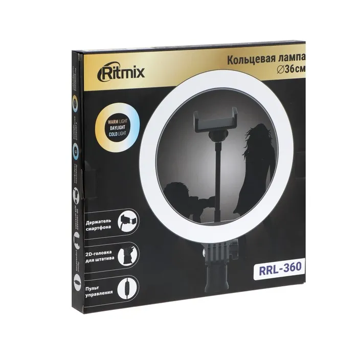 Кольцевая лампа Ritmix RRL-360, 36 см, USB, 3 цвета, 192 светодиода, пульт, держатель — Характеристики