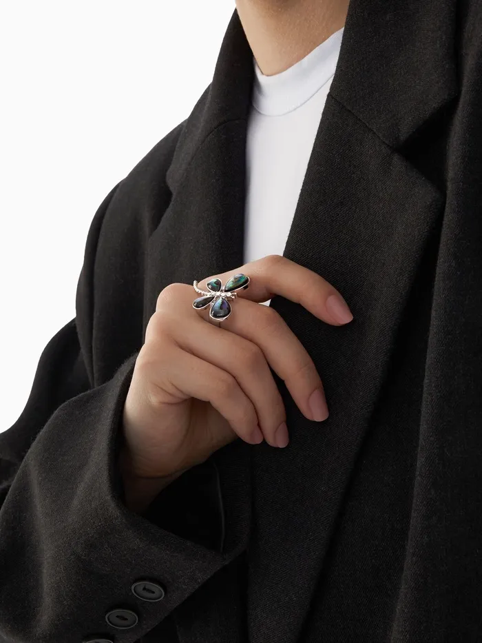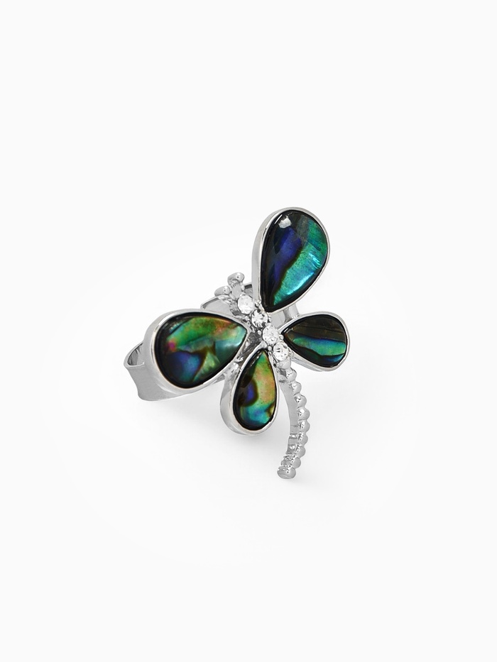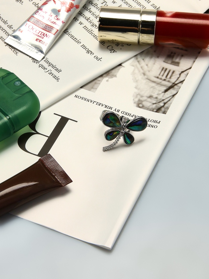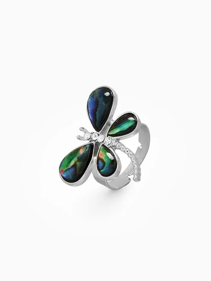 Откройте для себя невероятное украшение, которое добавит волшебства в ваш образ — кольцо в форме стрекозы, выполненное из галиотиса и обрамлённое в серебристый металл. Это изысканное кольцо не только привлекает внимание своим уникальным дизайном, но и символизирует лёгкость и грацию.