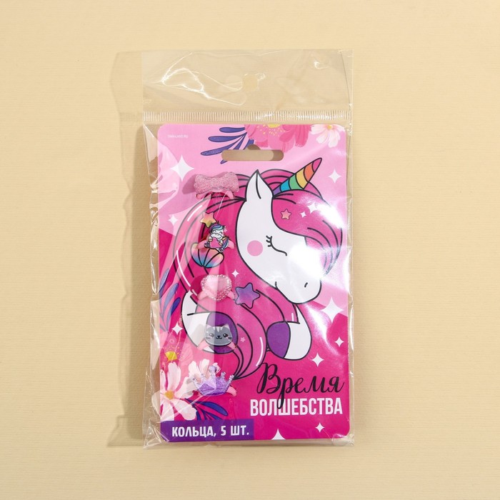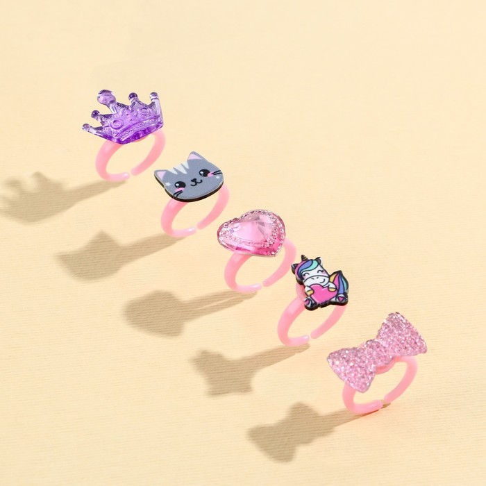 Набор колец с различными дополнительными элементами (5 штук). Детское кольцо - это отличный аксессуар, который дополнит любой наряд (праздничное платье, костюм, пиджак или блузку). Детское колечко можно легко регулировать по размеру. Также, такое украшение можно преподнести в качестве подарка ребенку, сестре, племяннице, внучке или дочери, ведь упаковано оно в подарочную упаковку.