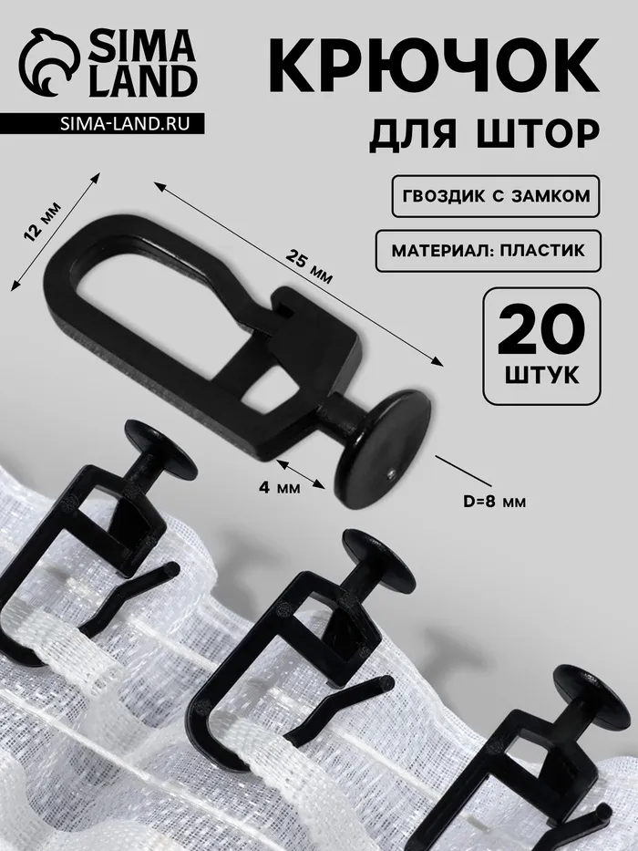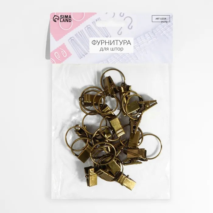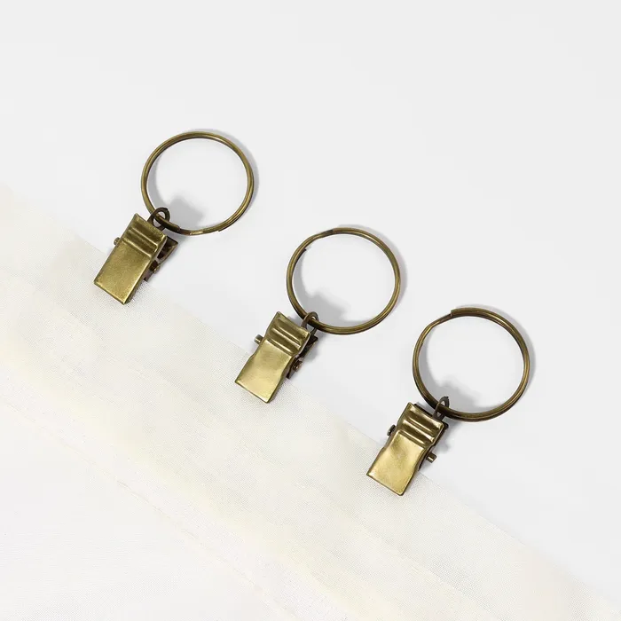 Зажимы для штор с кольцом помогают закрепить ткань на карнизе без петель и прошивки. Набор из двадцати штук подходит для тонких струнных систем и небольших карнизов.