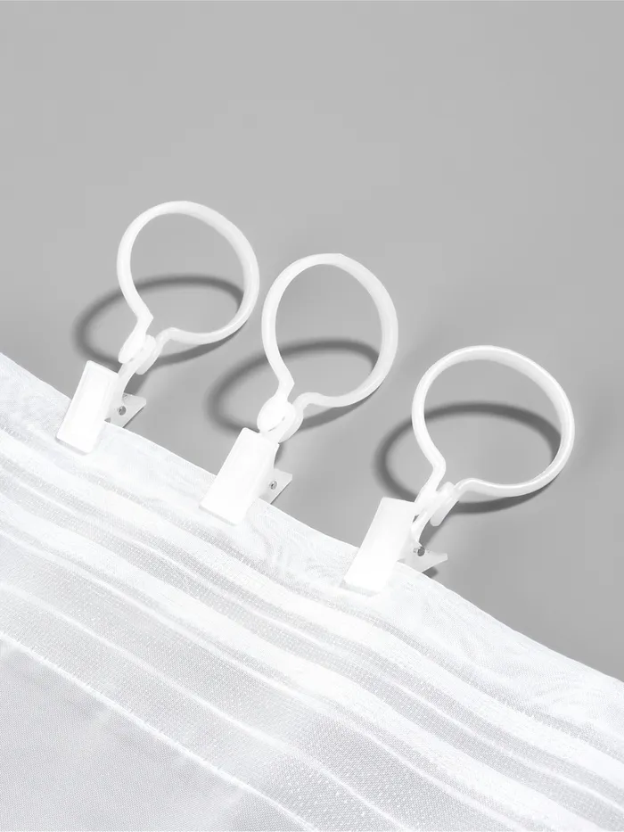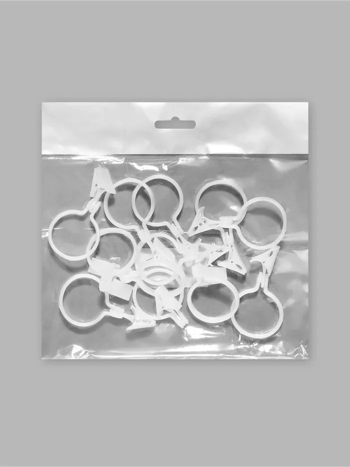 Эти кольца экономят время при монтаже и обеспечивают плотное прилегание штор к карнизу. Защёлкивающийся механизм позволяет быстро снимать и вешать занавески, а белый цвет делает их незаметными на фоне потолка или стены. Подходят как для дома, так и для временных установок в офисах или студиях.