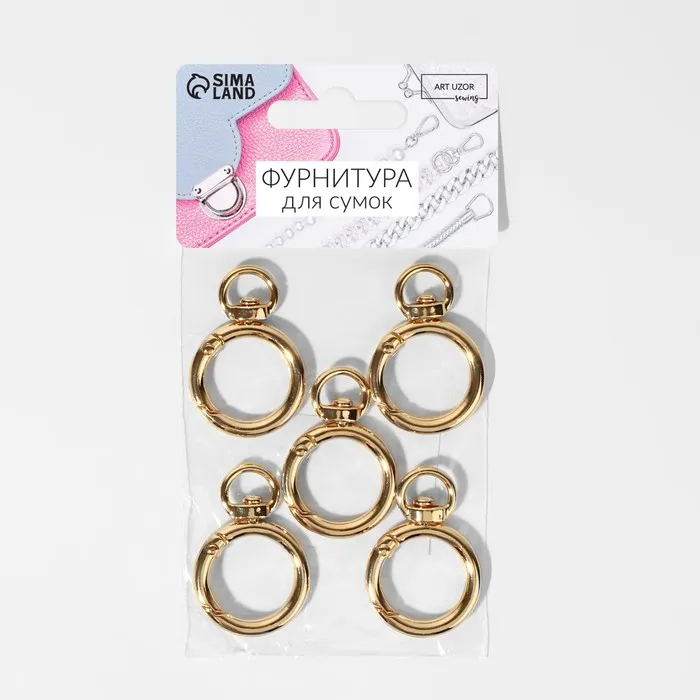 Кольцо-карабин, двойной, d=19/27 мм, толщина - 4 мм, с креплением 9×2.2 мм, 5 шт., цвет золотой