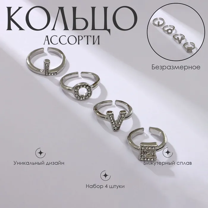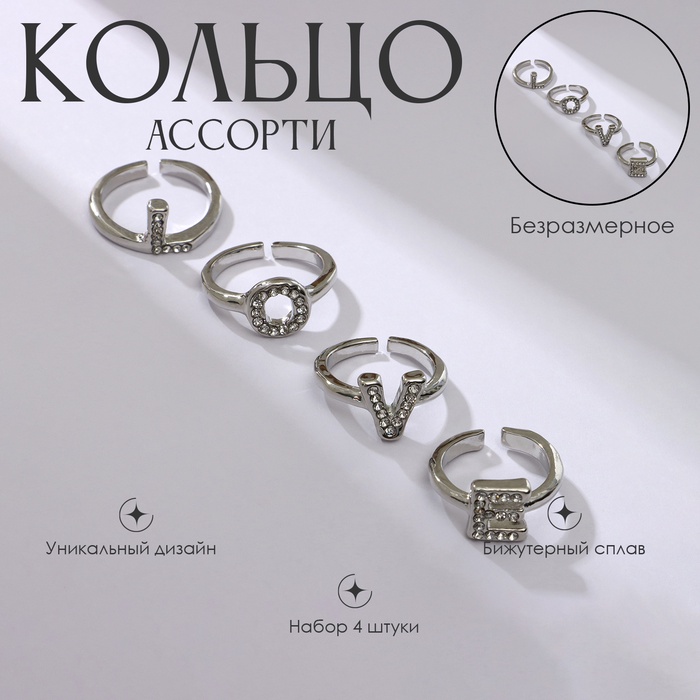 Кольцо набор 4 шт «Ассорти» love, цвет серебро, безразмерное — Характеристики