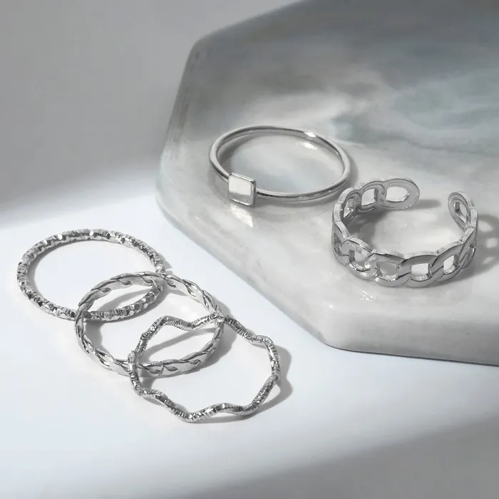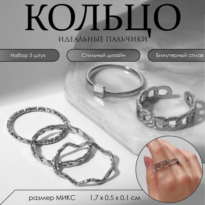 Кольцо набор 5 штук «Идеальные пальчики» геометрия, цвет белый в серебре — Характеристики