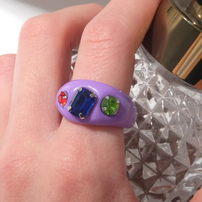 - Стильный и яркий дизайн: фиолетовый цвет и разноцветная вставка придают кольцу привлекательность, делая его настоящим украшением для любой женщины.