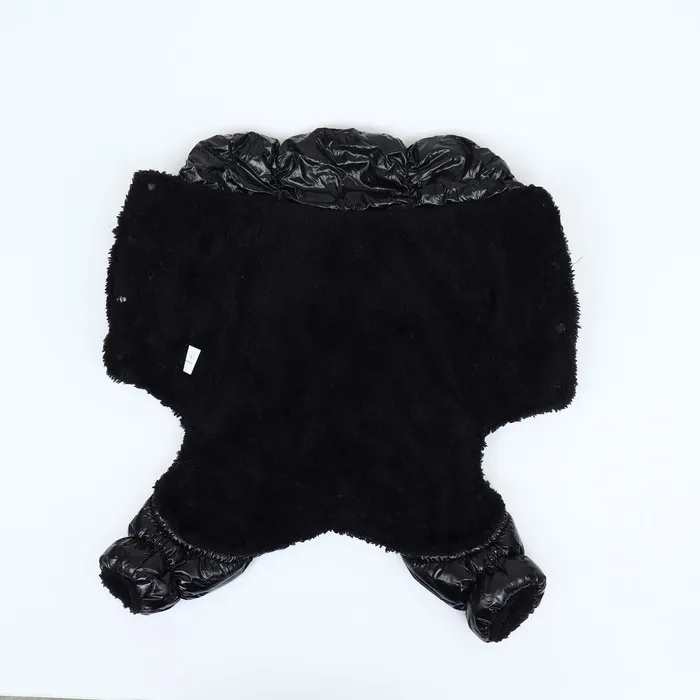 Комбинезон выполнен из нейлона, обеспечивая защиту от влаги и ветра, а внутри утеплен искусственным мехом для максимального тепла и комфорта. Комбинезон оснащен кольцом на спине, чтобы пристегивать поводок для прогулки, а также клепками на животе, что обеспечивает легкое надевание и снятие комбинезона.