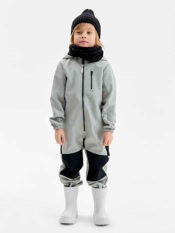 Серый демисезонный комбинезон для мальчика — отличный выбор для прогулок в межсезонье. Выполнен из материала Softshell, он сочетает в себе водонепроницаемые свойства и комфортный внутренний флисовый слой, что защищает от промокания и сохраняет тепло.