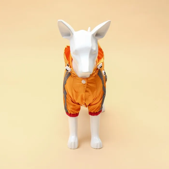 Комбинезон застегивается на кнопки, на лапах есть утягивающие резиночки, а на капюшон защитит вашего питомца от ветра, пыли и дождя.