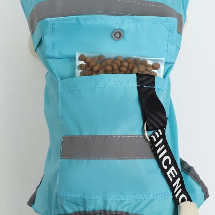 Также на корпусе имеются светоотражающие полосой, отверстие для быстрого пристегивания поводка и кармашек для лакомств.