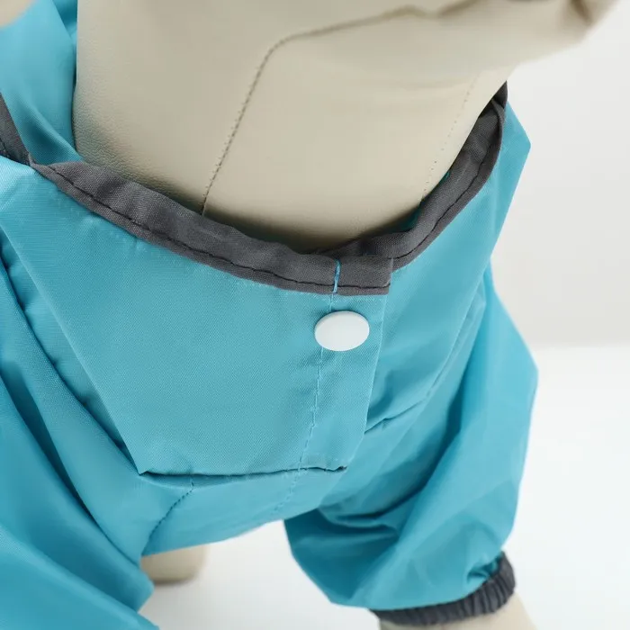 Комбинезон застегивается на кнопки, на лапах есть утягивающие резиночки, а на капюшоне есть прозрачный козырек, который защитит вашего питомца от ветра, пыли и дождя.
