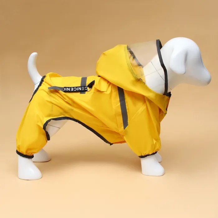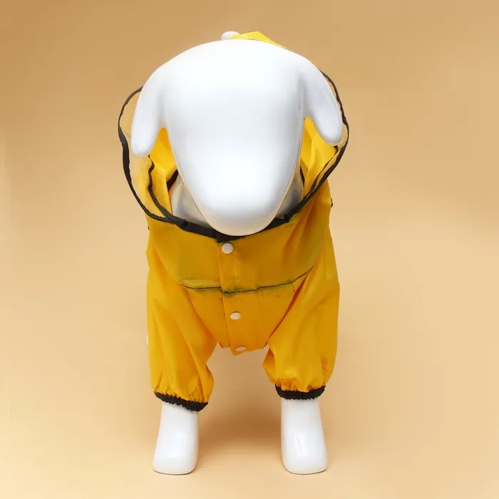 Комбинезон застегивается на кнопки, на лапах есть утягивающие резиночки, а на капюшоне есть прозрачный козырек, который защитит вашего питомца от ветра, пыли и дождя.
