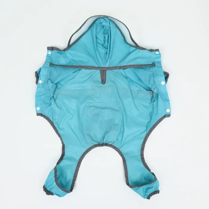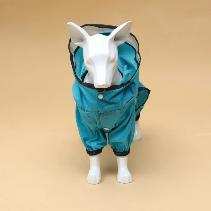 Комбинезон застегивается на кнопки, на лапах есть утягивающие резиночки, а на капюшоне есть прозрачный козырек, который защитит вашего питомца от ветра, пыли и дождя.