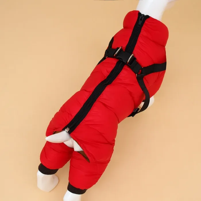 Комбинезон оснащен шлейкой, которая обеспечивает дополнительную безопасность при прогулках. Шлейка легко регулируется, что позволяет подогнать ее точно под размеры вашей собаки. Это гарантирует удобство и свободу движений вашего питомца.