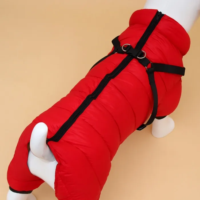 Комбинезон оснащен шлейкой, которая обеспечивает дополнительную безопасность при прогулках. Шлейка легко регулируется, что позволяет подогнать ее точно под размеры вашей собаки. Это гарантирует удобство и свободу движений вашего питомца.