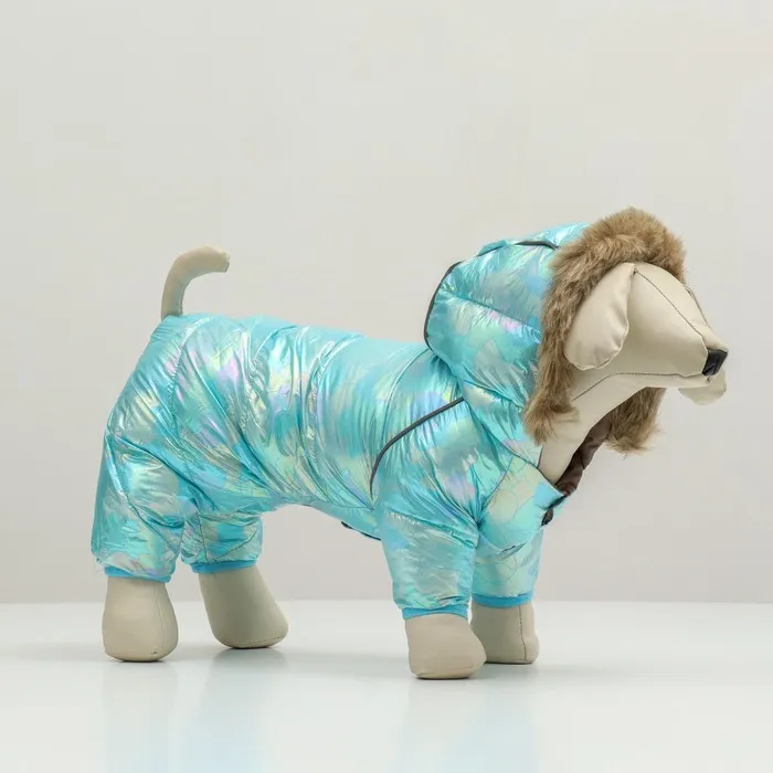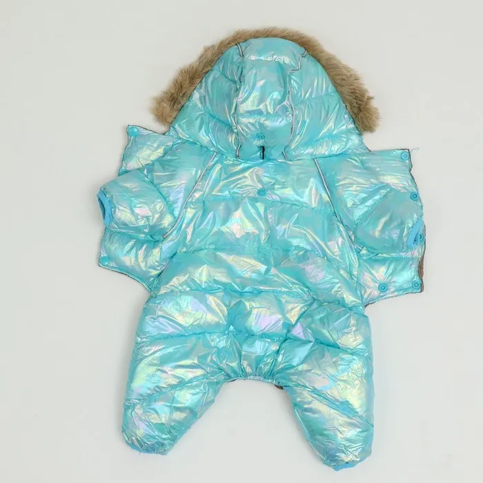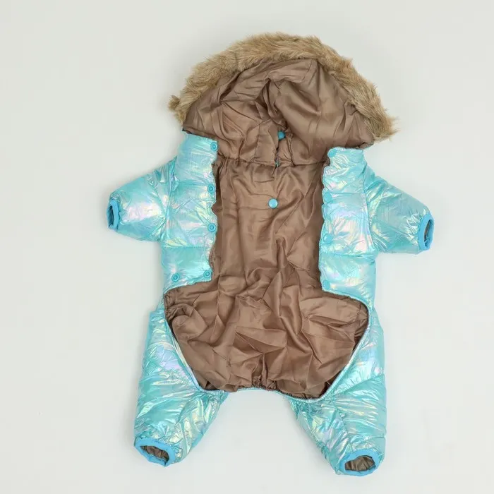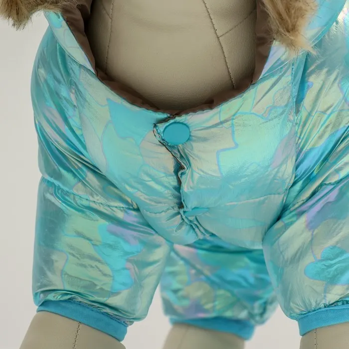 Капюшон комбинезона украшен мехом, что придает ему изысканный и модный вид.