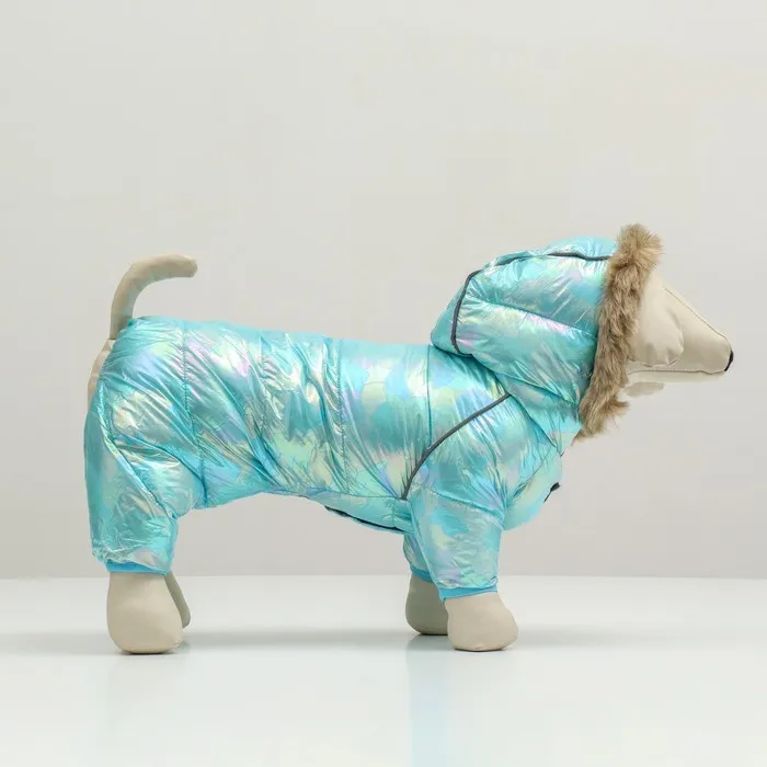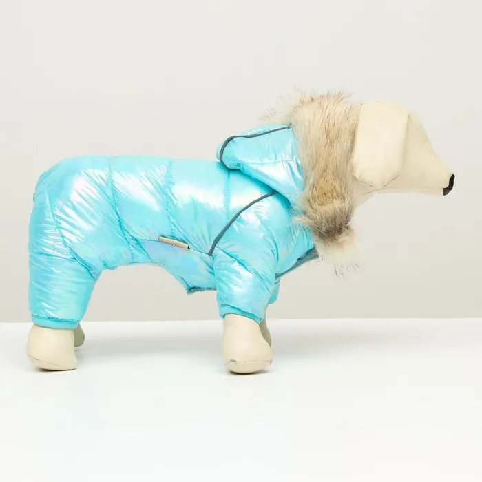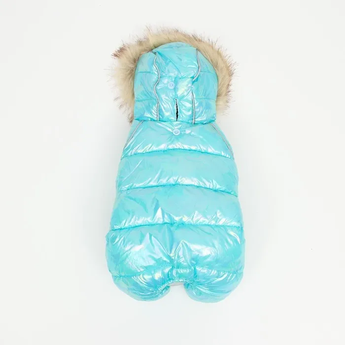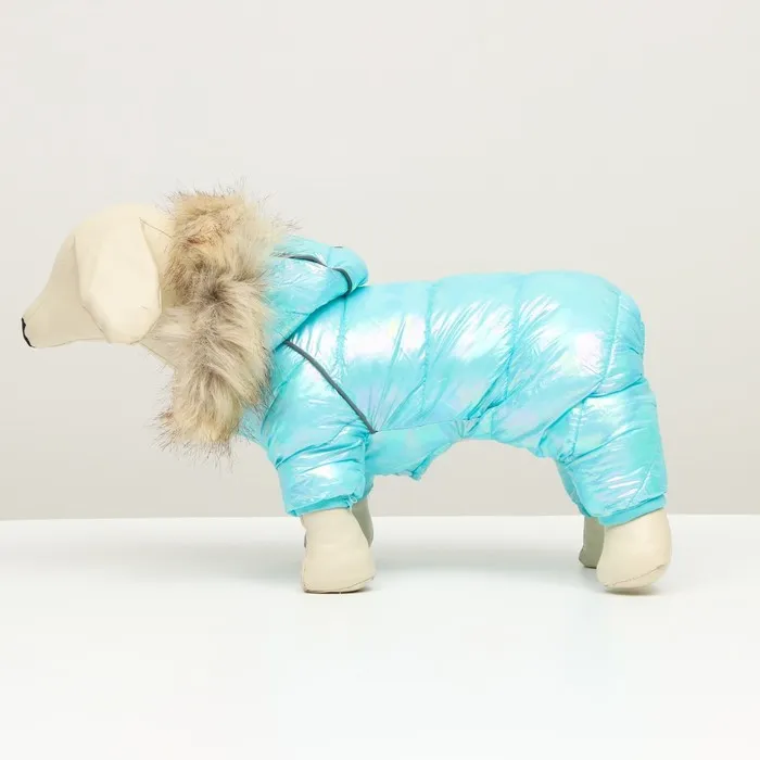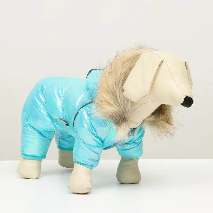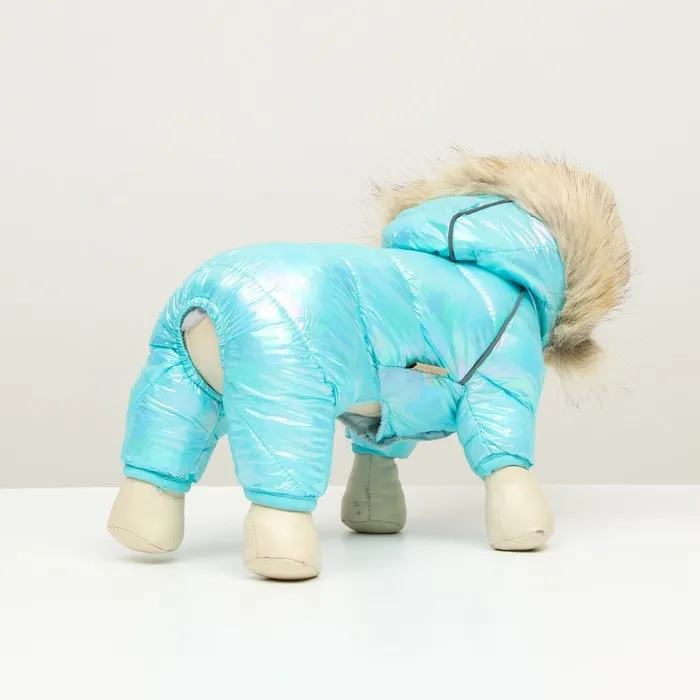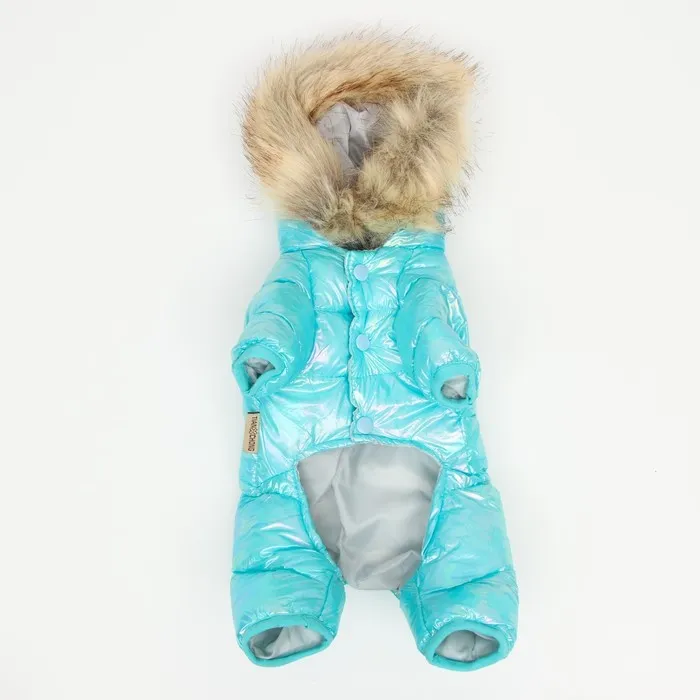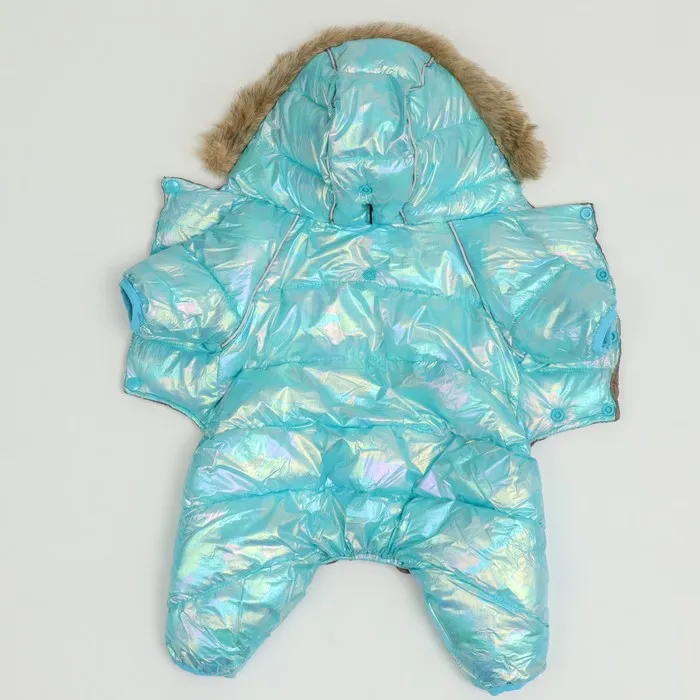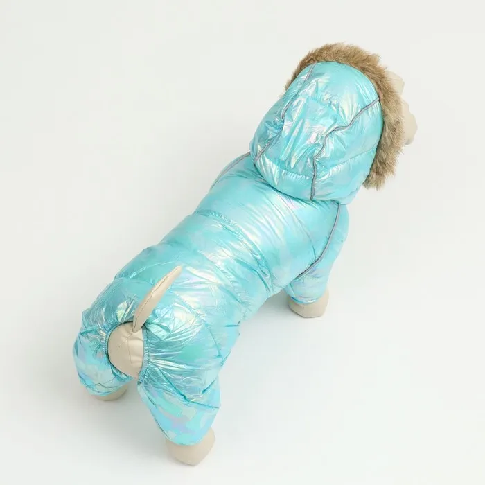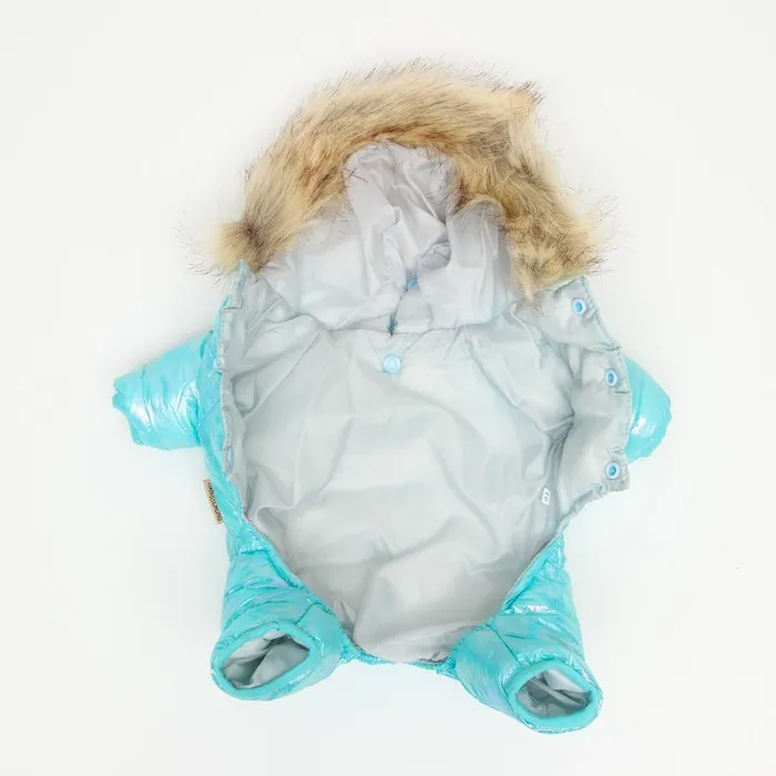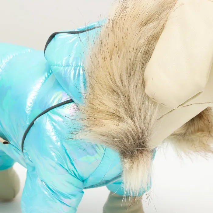 Капюшон комбинезона украшен мехом, что придает ему изысканный и модный вид.