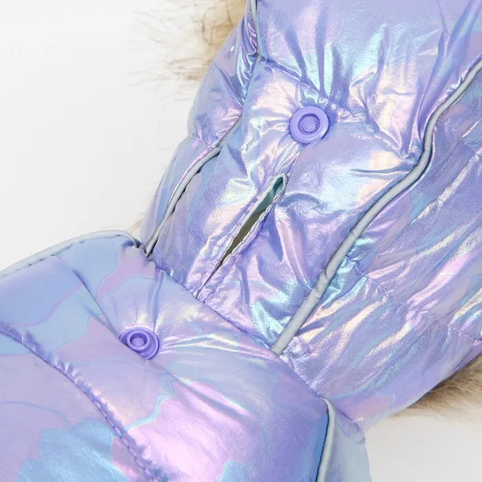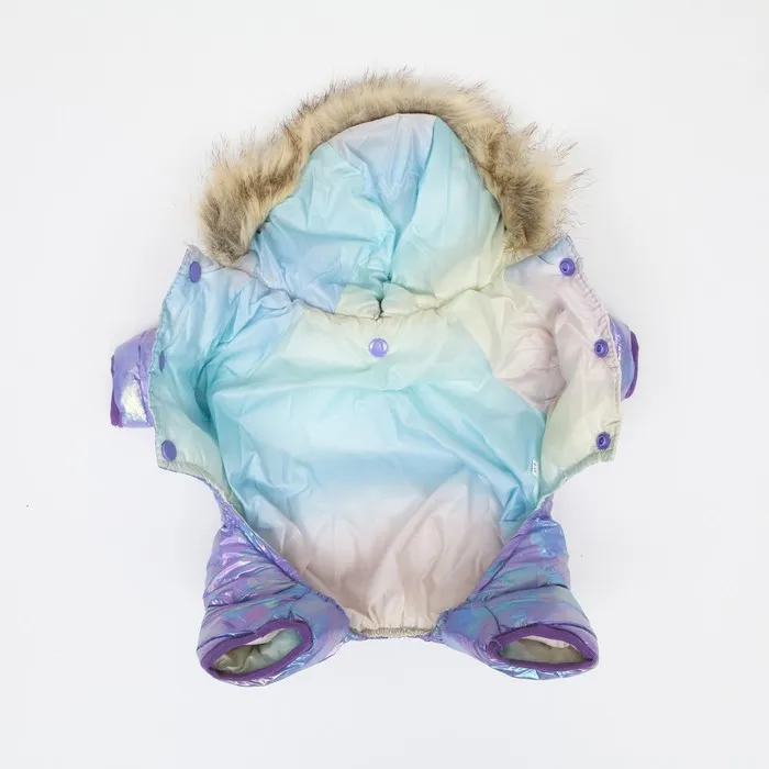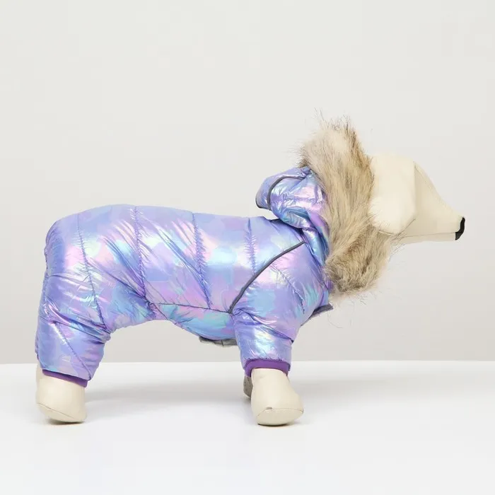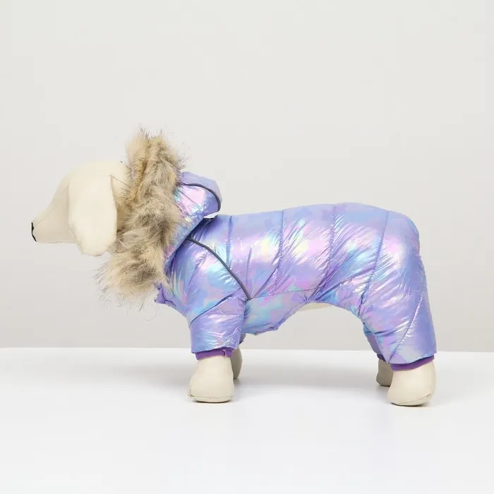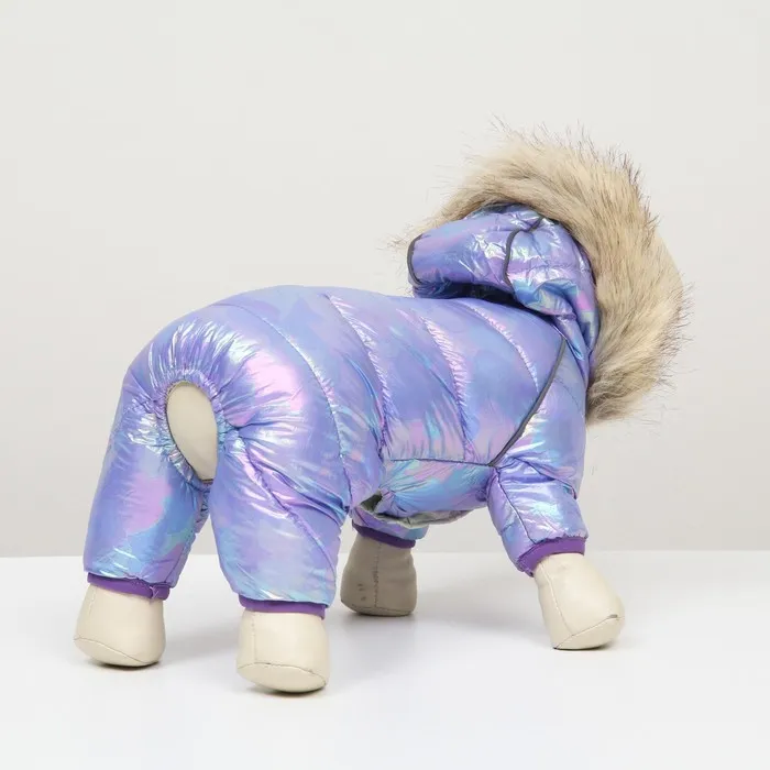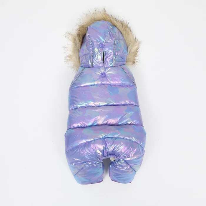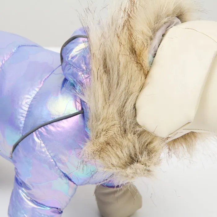 Капюшон комбинезона украшен мехом, что придает ему изысканный и модный вид.