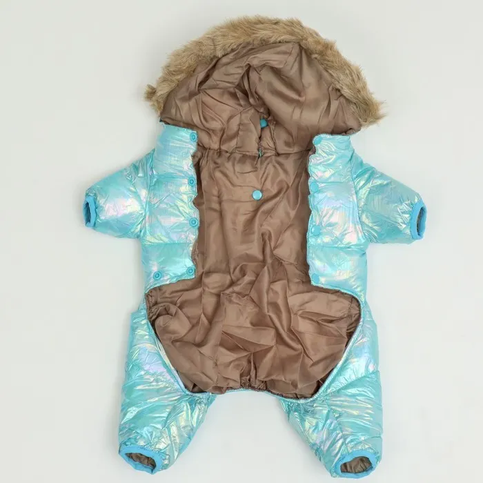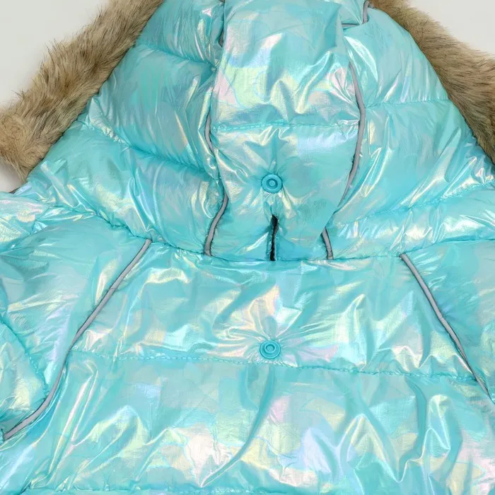 Капюшон комбинезона украшен мехом, что придает ему изысканный и модный вид.