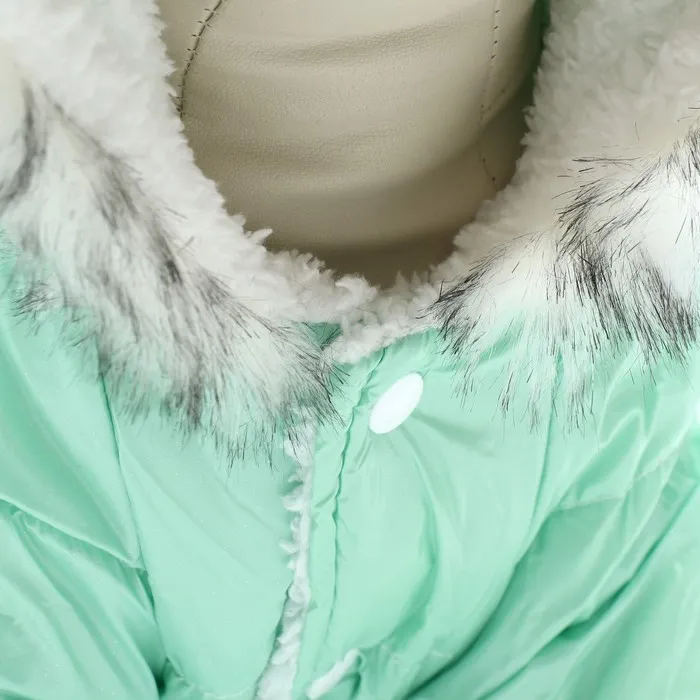 Комбинезон выполнен из нейлона, обеспечивая защиту от влаги и ветра, а внутри утеплен искусственным мехом для максимального тепла и комфорта. Комбинезон оснащен клепками на животе, что обеспечивает легкое надевание и снятие комбинезона.