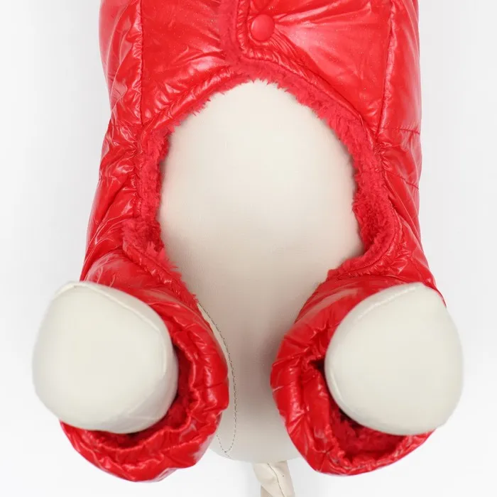 Комбинезон выполнен из нейлона, обеспечивая защиту от влаги и ветра, а внутри утеплен искусственным мехом для максимального тепла и комфорта. Комбинезон оснащен клепками на животе, что обеспечивает легкое надевание и снятие комбинезона.