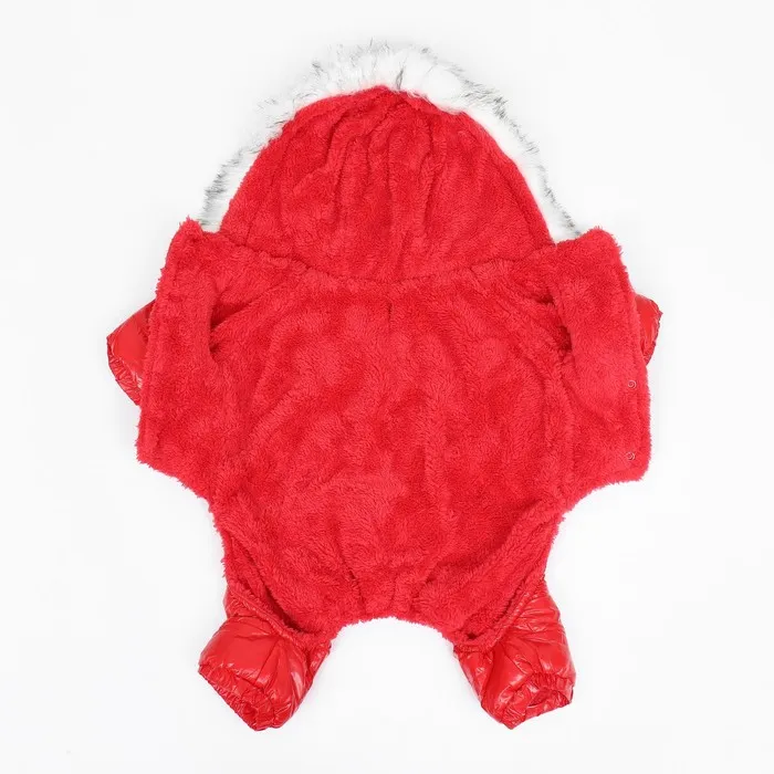 Комбинезон выполнен из нейлона, обеспечивая защиту от влаги и ветра, а внутри утеплен искусственным мехом для максимального тепла и комфорта. Комбинезон оснащен клепками на животе, что обеспечивает легкое надевание и снятие комбинезона.