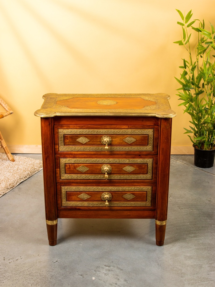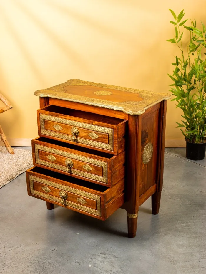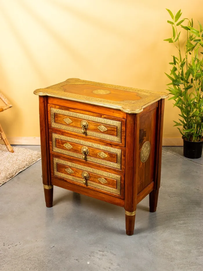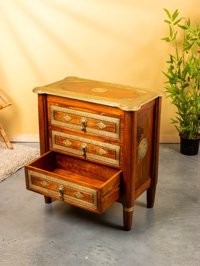 Просторная прикроватная тумба из массива дерева размером 70×42×76 см в благородном оттенке венге. Три вместительных ящика с латунной фурнитурой и продуманная система хранения. Готовая конструкция с точной фрезеровкой деталей — идеальное решение для просторных спален.